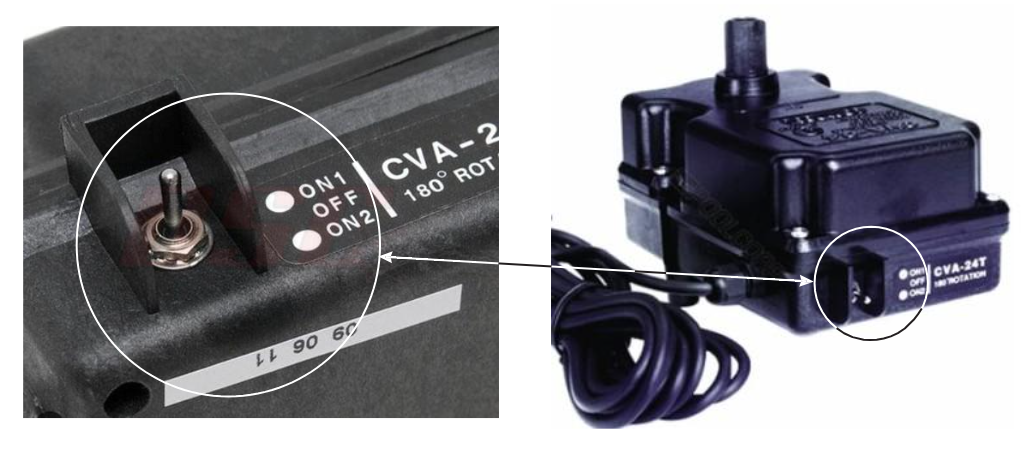 Because manufacturers do not know how installers will plumb a 3-way valve, actuators include a three-position toggle switch labeled ON1, OFF, and ON2. This switch reverses the direction of rotation or disables the actuator entirely. During startup, the installer sets the switch to match the plumbing configuration. In theory, the switch should never need to be touched again.