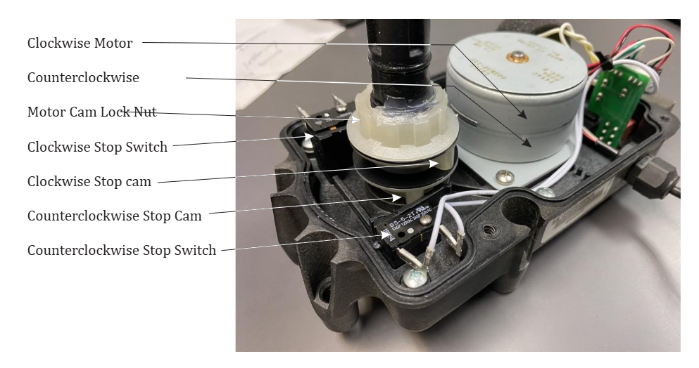 Inside every 24VAC actuator are two small motors—one for clockwise rotation and one for counterclockwise rotation. Two adjustable cams on the main shaft engage microswitches that stop each motor at the correct position. These cams are factory-set to allow a 180-degree rotation. The actuator receives power through a three-wire cable consisting of two power leads